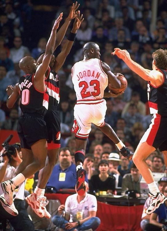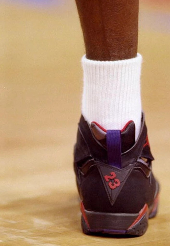 In his second NBA Finals MJ donned the Air Jordan 7 ‘Raptors‘ as he faced the Portland Trail Blazers. Designed with the Toronto Raptors in mind the Air Jordan 7 Raptors has a black nubuck upper, with purple and red accents on the midsole and grey details on the tongue and heels.