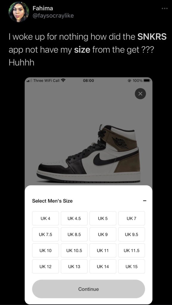 Who knows what’s happening over at Nike, but something isn’t clicking. A similar issue identified with gendered sneakers is the lack of inclusive sizing, this sneaker release wasn’t “problematic” in that sense, but although a full-size run was advertised, from a UK 4-15 this wasn’t the case. People flocked to Twitter to rant and complain about the sizes that weren’t in the release: these included a UK 5.5, UK 6, UK 6.5, UK 8. Some larger half sizes weren’t available either, which isn’t okay but expected.