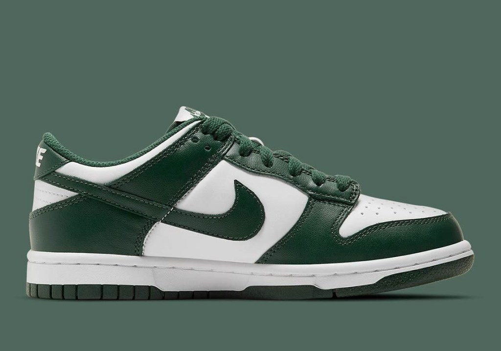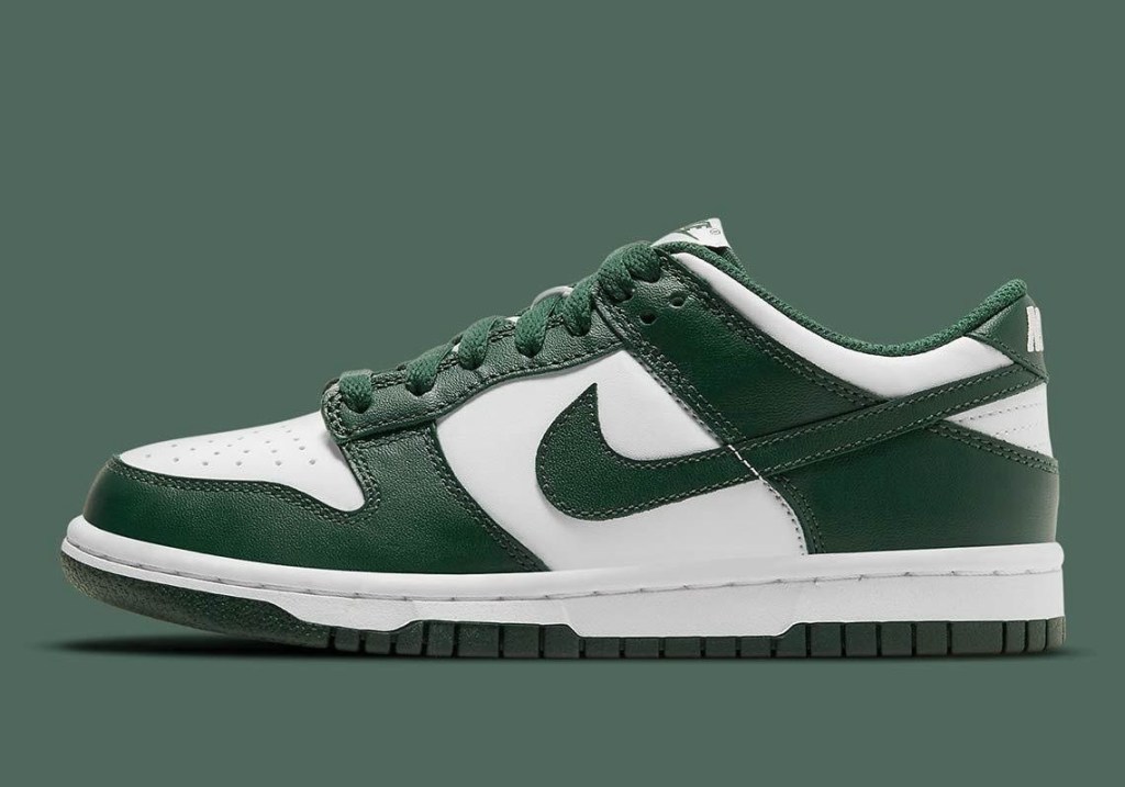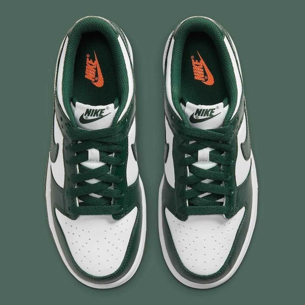 Just like the ‘Michigan’ colourway, this won’t be the first time you’ve seen this green and white on a Nike Dunk. In 2020 the Dunk High released in the same colourway. If you’re not a fan of Highs, here’s your alternative. Deep green overlays and white panels cover this silhouette from front to back, with an unexpected orange Nike logo on the insole.