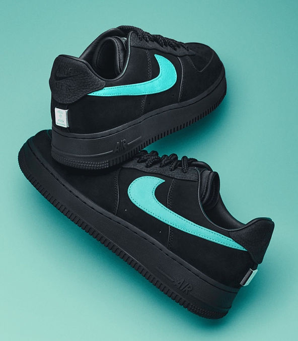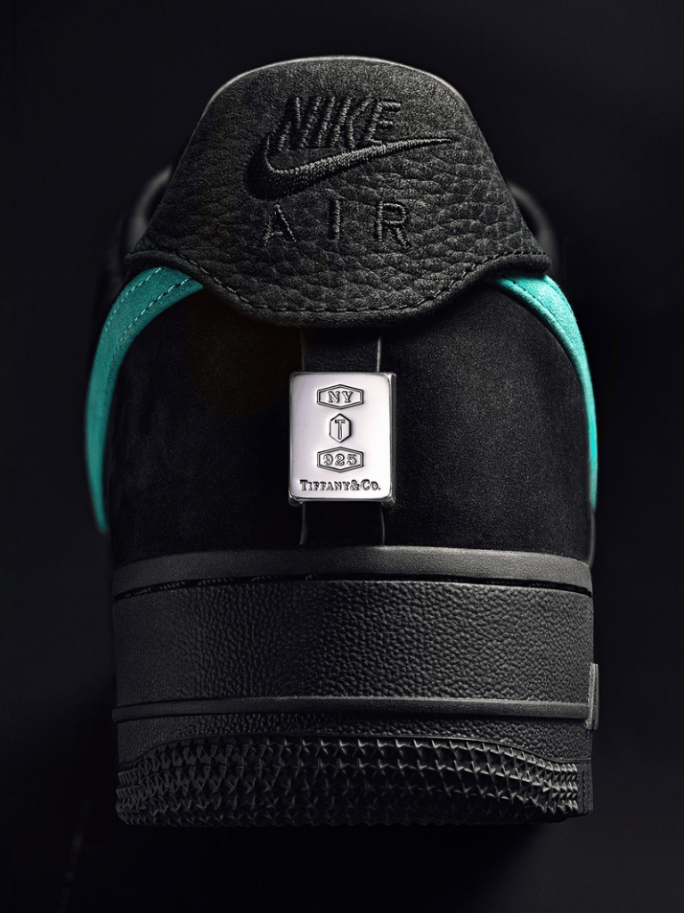 An all-black suede material covers the upper, with a rich Tiffany blue swoosh stealing the limelight. ‘Tiffany’ in a swirly font replaces the usual Nike Air logo on the tongue, and Metallic silver detailing on the heel ties the luxury look together.